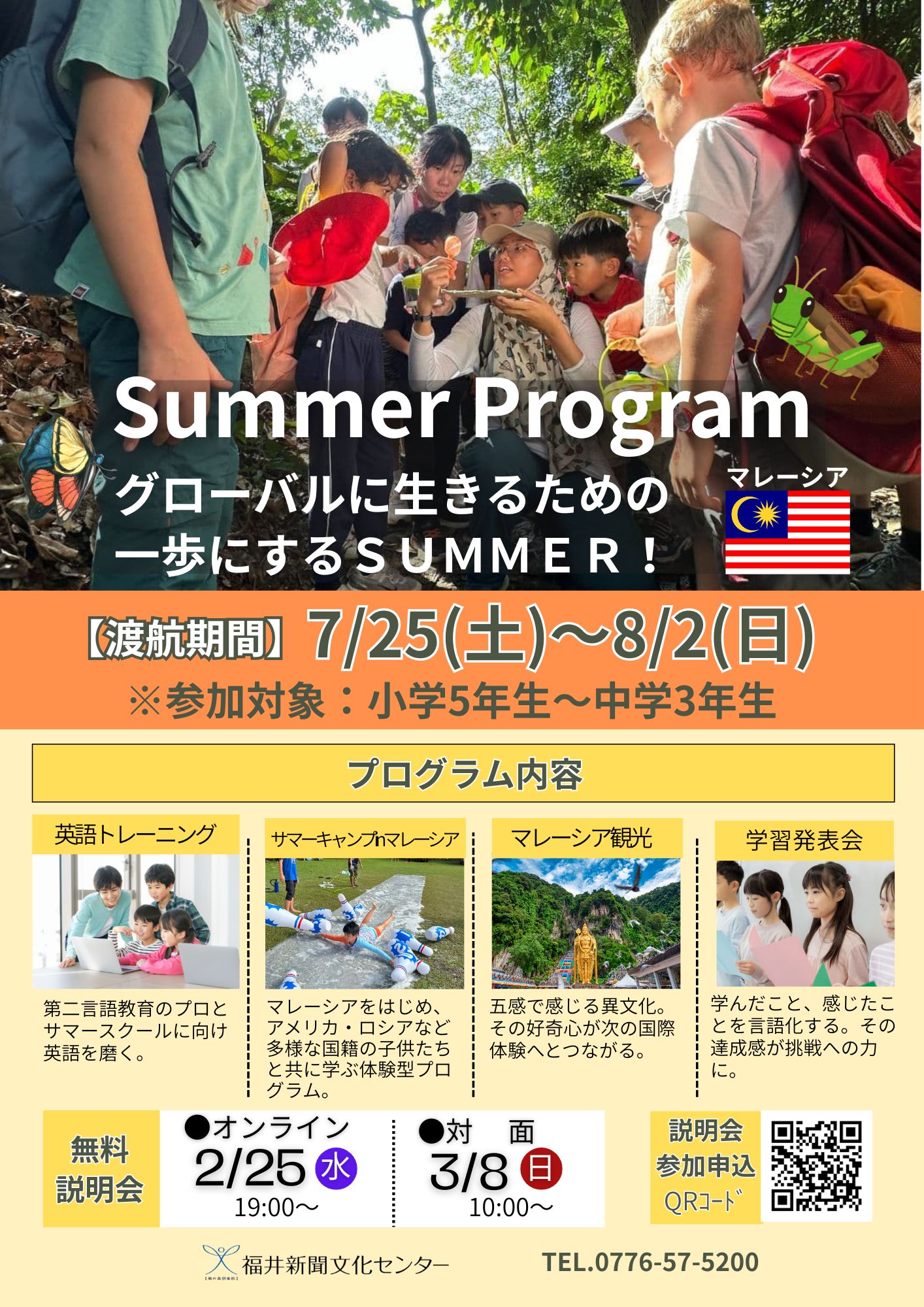 小学5年生から中学3年生を対象にしたマレーシア・サマープログラムをご用意しました。多国籍の仲間と大自然に囲まれて過ごす、ワクワクの1週間が待っています。